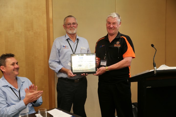 Gordon Hall presenting the NSW SES with the plaque on behalf of the Nation Association