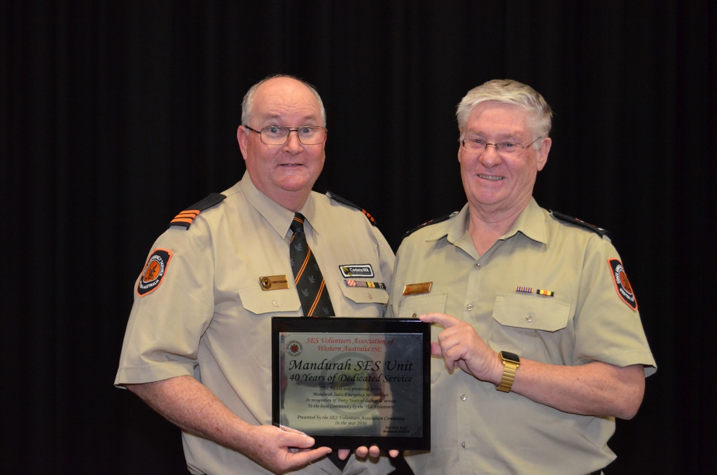 On Thursday 1 December the Mandurah SES Unit conducted its annual awards night. The work of many Volunteers was acknowledged that night and in particular the SES Cadets. During the nights proceedings, the SESVA President, Gordon Hall, acknowledged the phenomenal amount of work the SES Volunteers and cadets have put into the Unit over the past forty years. Gordon also acknowledged the dedication over many years and the work put in by Local Manager Chris Stickland and his team in getting the cadets to the level they are today. Gordon presented the unit with a plaque celebrating their forty years and acknowledging the amount of assistance and work the SES Volunteers put into the local community.