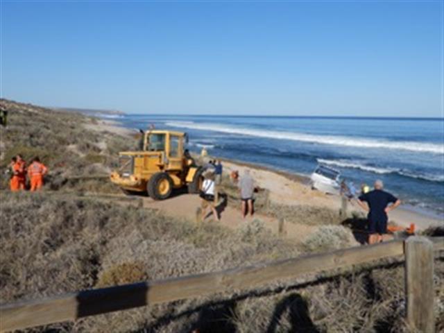On May 12 a boat struck trouble near the river mouth and was subsequently washed ashore over rocks near Chinamans Point. 3 Kalbarri SES volunteers responded to this incident where they helped to enforce an exclusion zone while Kalbarri Volunteer Fire and Rescue Service members ensured that no fuel was leaking from the vessel.